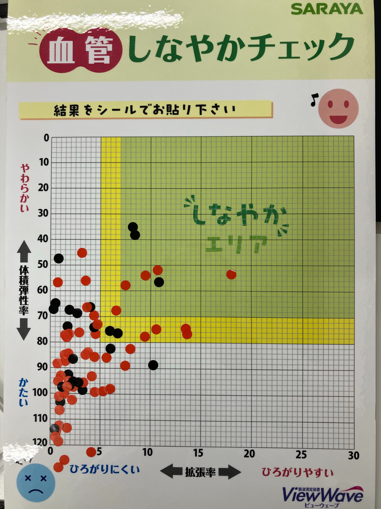 当日は77名の方に「脈波測定装置ViewWave」を測定いただき、ご自身の結果が〝しなやかエリア〟に位置するのかパネルにシールを貼っていただきました。