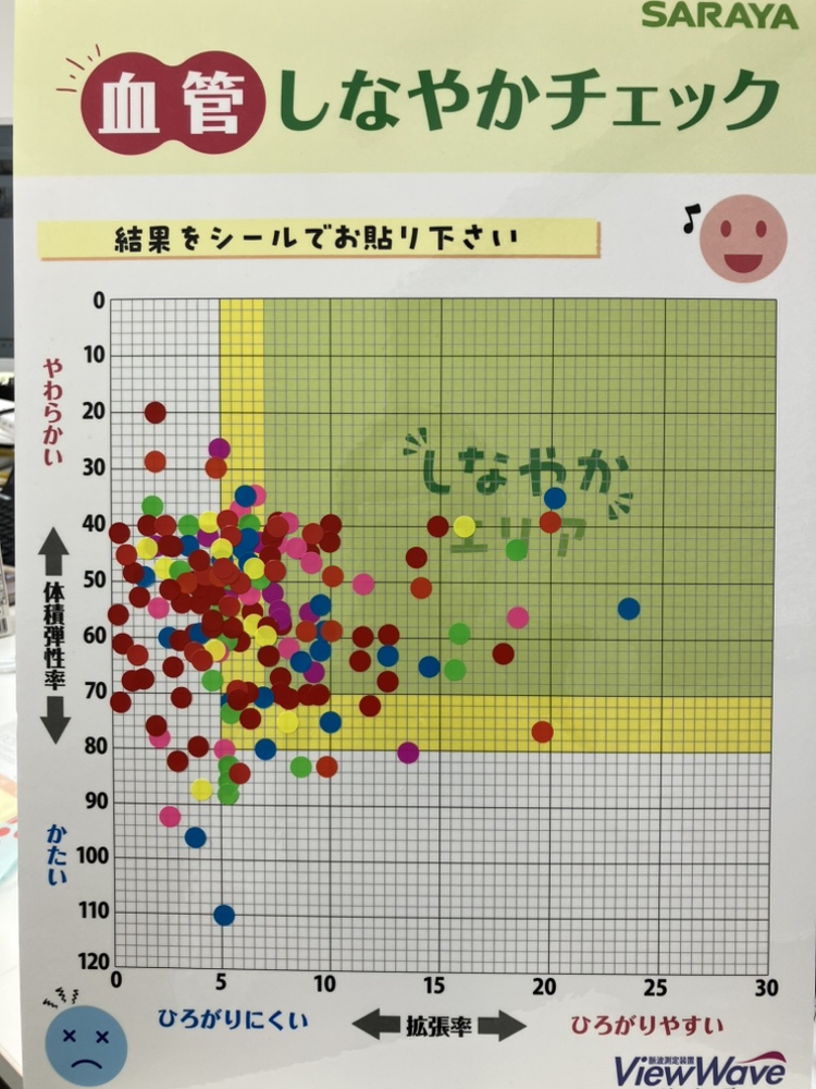 2日間で167名の方に測定いただき、「血管のしなやかさチェック」を行った方にはパネルにご自身の結果をシールで貼っていただきました。